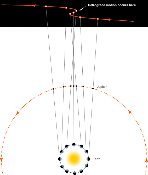 ![]() Illustration of retrograde motion. The top panel shows the apparent position of Jupiter against the night sky, as seen from the Earth, during a retrograde event. The bottom panel shows the sight lines from the Earth to Jupiter at different points in the orbits of the two planets. As can be seen, Jupiter does not in fact move backward at any time. It appears to do so as seen from the Earth because the Earth is moving faster than Jupiter and passes it. The effect is exactly similar to passing a car on the expressway and watching it move "backward" as you go by. The retrograde motion of the planets was impossible to explain using a model of perfect spheres centered on the Earth, so epicycles and other embellishments were added to the Earth-centered model of the Universe to fix it. |
